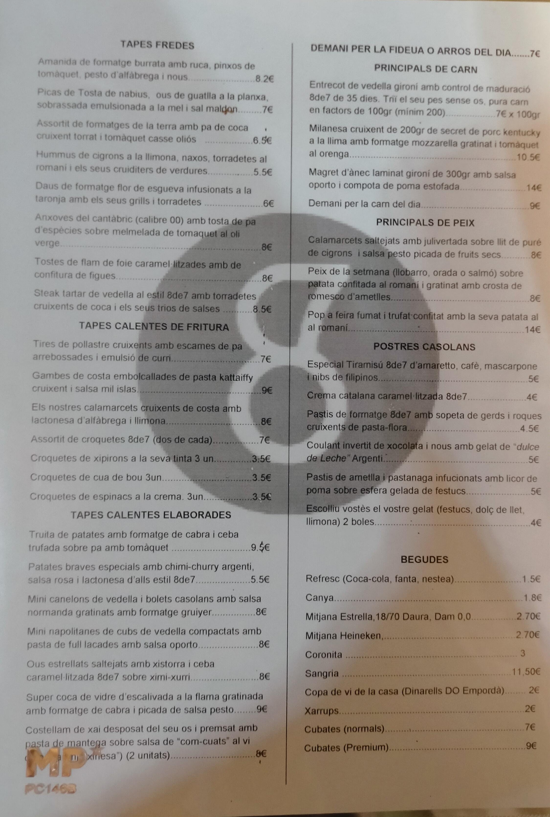 Sense gaires luxes. Servei molt amable i professional. Bon parament. Tovallons de paper. La carta ofereix tapes fredes, tapes calentes de fritura, tapes calentes elaborades, principals de carn i de peix, i postres casolanes, amb presentacions molt acurades.