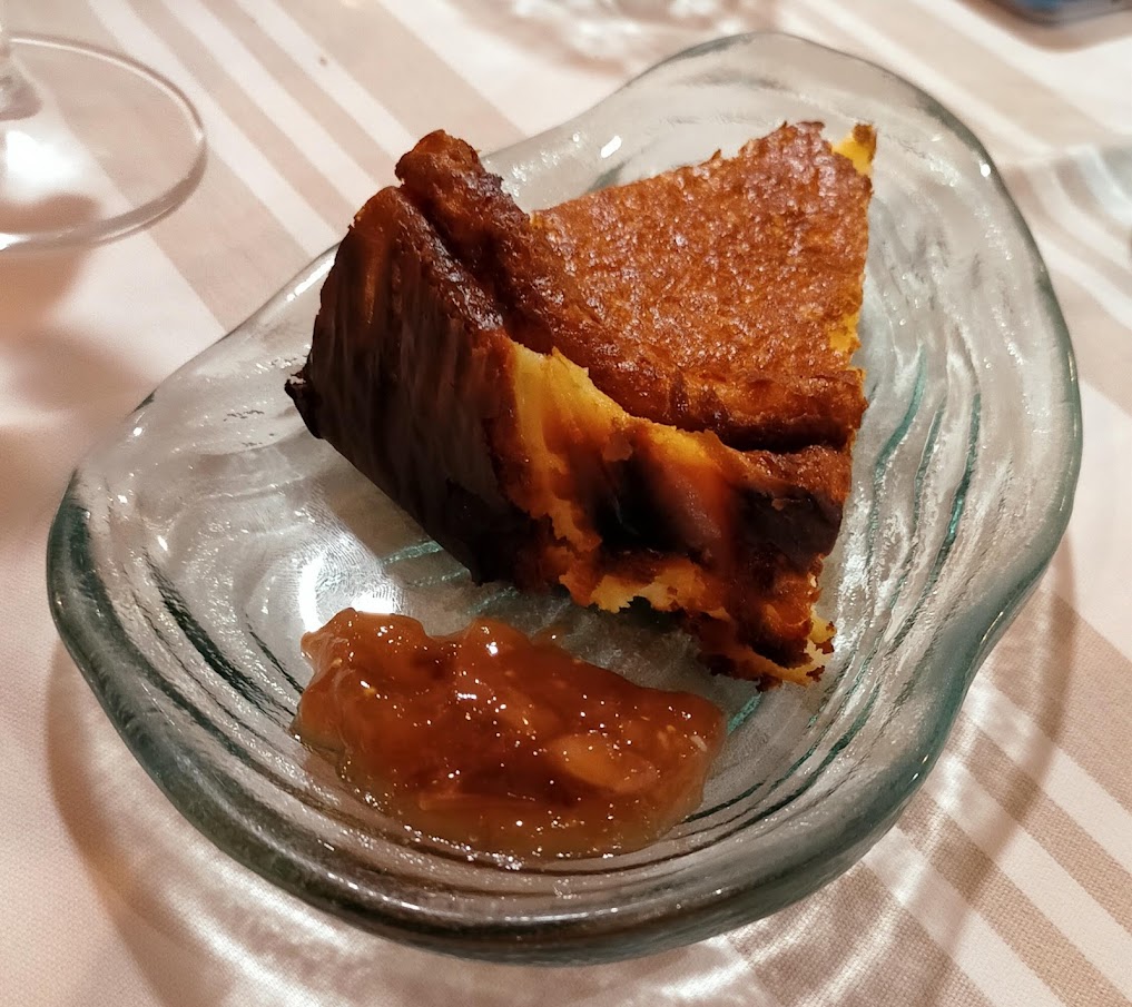 Ho teníem pendent i vam anar a tastar el txuletón. Reservàrem per sopar al menjador interior. Malgrat la calor, la terrassa estava plena. Sopar lleuger per a tres a base de plats per compartir. Començàrem amb uns canapès de formatge fresc, tomàquet i codonyat, obsequi de la casa. Lleugers, amb molt sabor a codonyat.