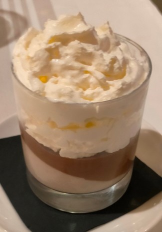 - Terrina de dues xocolates al cafè (7 €) - A petició meva, sense cafè. Molt bona. Jo li posaria menys nata i més xocolata.