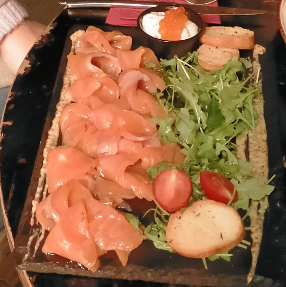 - Gravad Lax (9,70 €) - A casa també marinem el salmó, i aquest ens encantà. La salseta de mostassa, molt i molt escassa (rodolí). I de "lo verd" (ruca) tampoc no calia abusar...