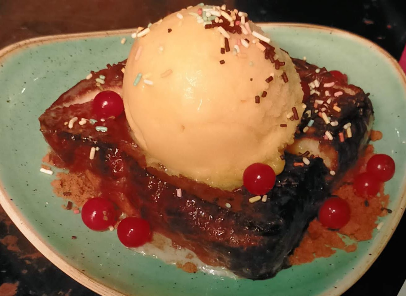 Malgrat que ningú volia postres, tret de mi, tothom s'apuntà a tastar la torrada de Santa Teresa a l'estil parada (5,80 €) tunejada per a mi, que no m'agrada el formatge. Tampoc no calia posar un pilot de sorbet de maracujà...