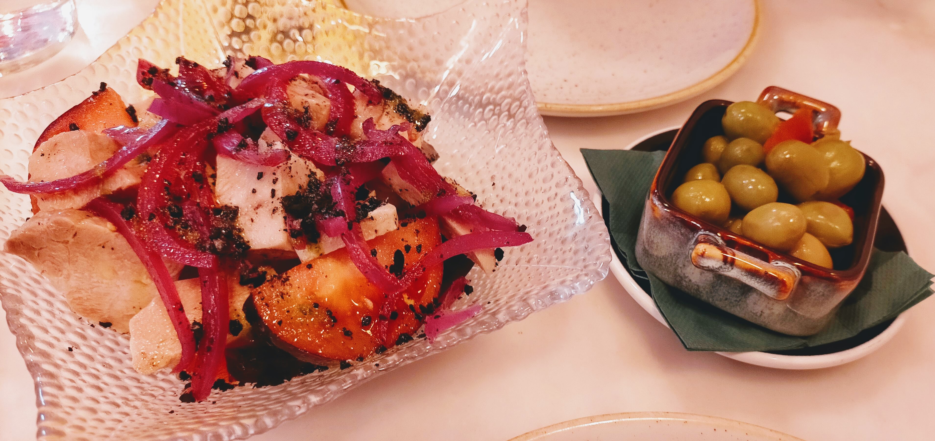Nos pusieron unas aceitunas ricas mientras esperábamos el primero, que compartimos, una ensalada de ventresca de atún fresca y ligera.