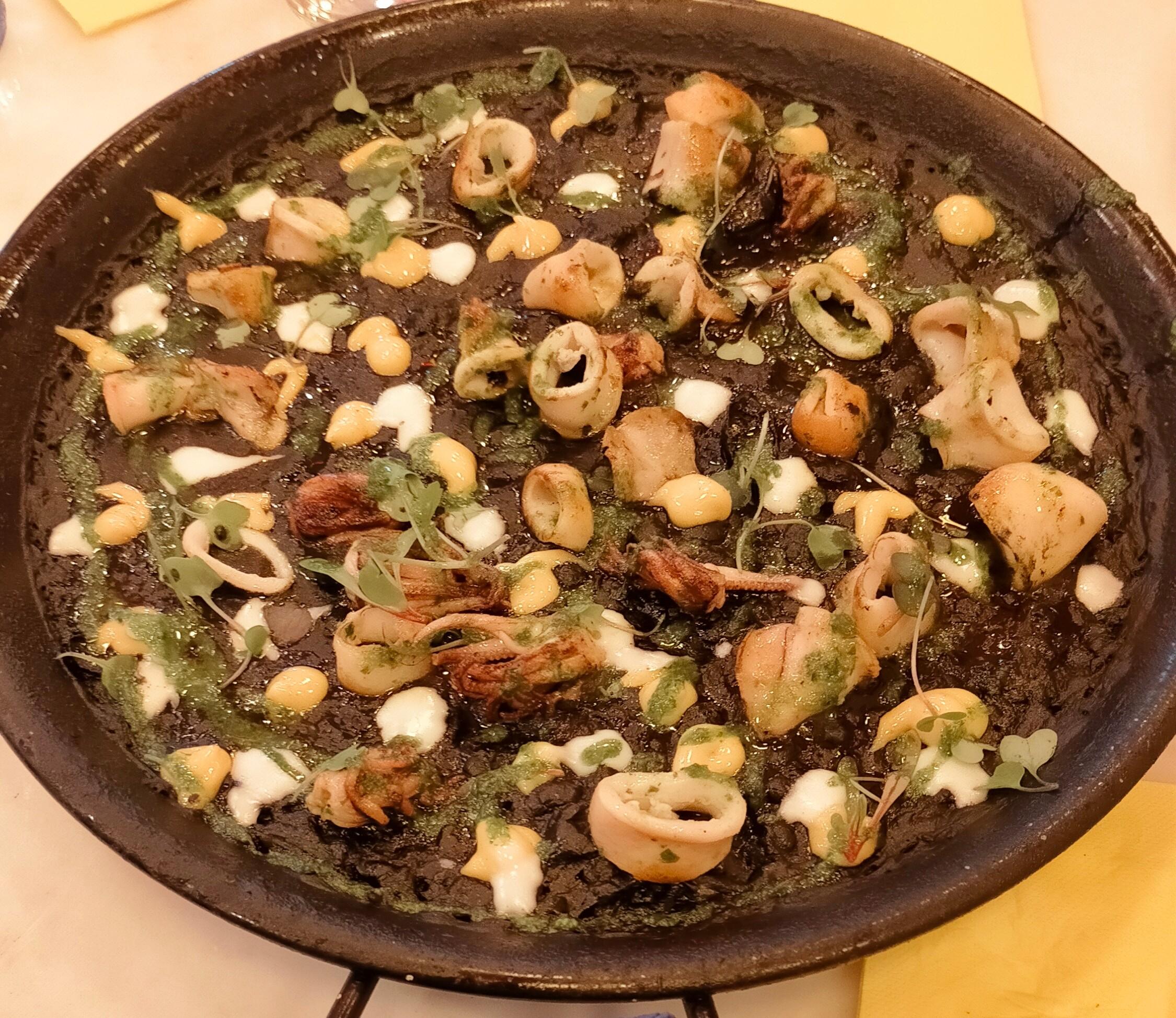 De segundo pedimos un arroz negro con calamares para dos, también muy bueno, aunque un pelín enganchado en algunos trozos. Dio para 3 raciones.