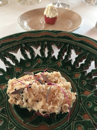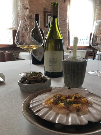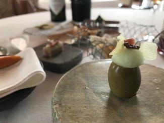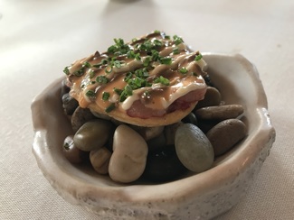 A partir de aqui, pedimos la carta de vinos y seleccionamos entre varios blancos, Sandhi "Sandford & Benedict" 2018, un Chardonnay de Santa Rita Hills ( Santa Barbara) en California, USA. Divino, elegante y sutil. en ese instante comenzamos con el menú degustación elegido por mi. Describo los nombres a mi manera y mi gusto, puesto que no tengo los exactos de la carta: