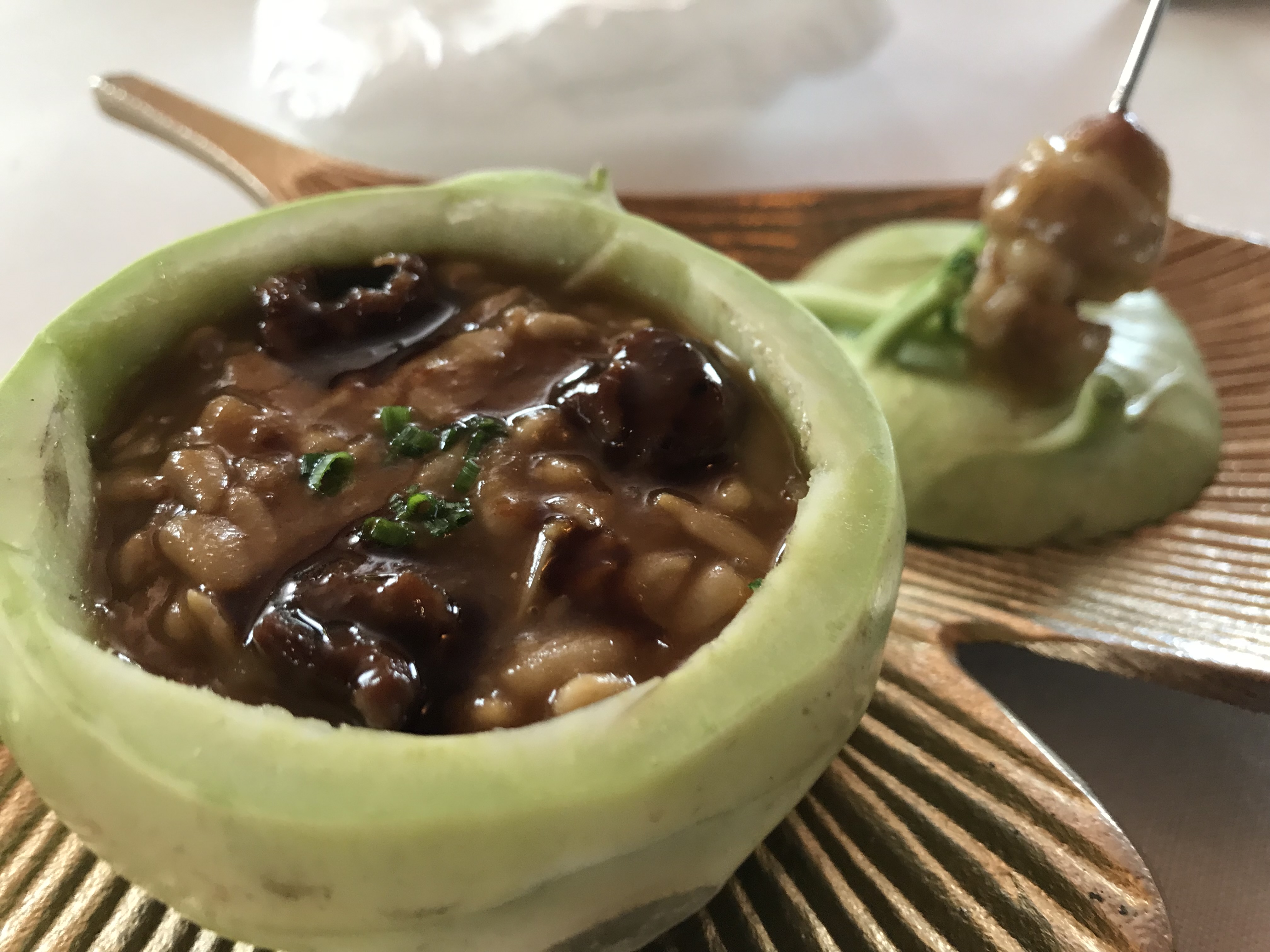 3-palmera de bogavante que de un bocado la revientas de buena,..jooo, y vieira-XO-jengibre buena y ya probada en su carpaccio, pero de buen sabor y textura además de calidad. Para finalizar , nos invitan a chupar caña de azúcar-cartojal para refrescar y pasar a los platos individuales ( no chupe´mucho).