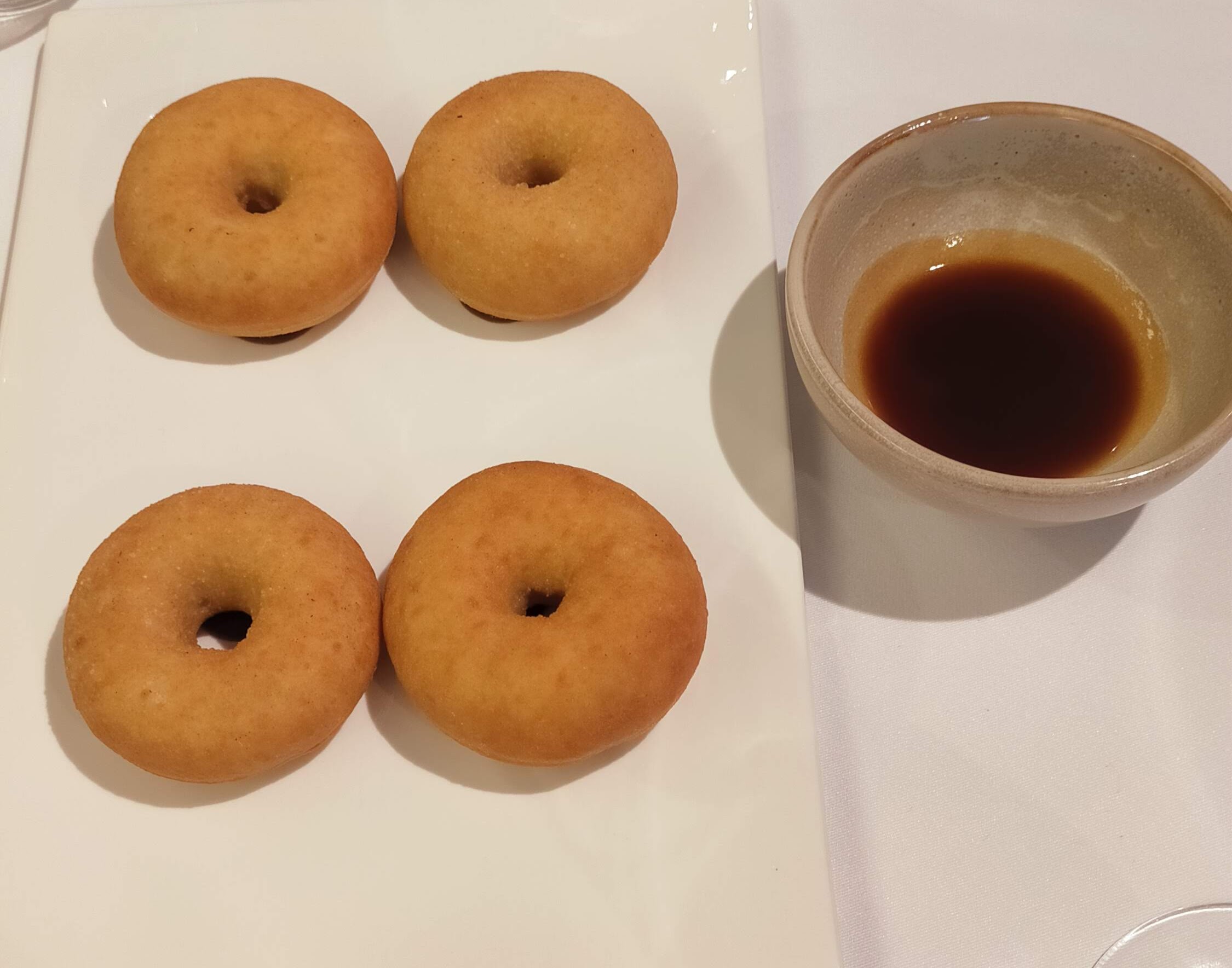 - Y llegaron los "donuts" como octavo plato. Recuerdo que comentamos que ya podrían venderlos en el super, en vez de esas... En fin, que nos parecieron excelentes, a pesar de que no recuerdo de que eran ni a qué sabían, ni las rosquillas ni la salsa.