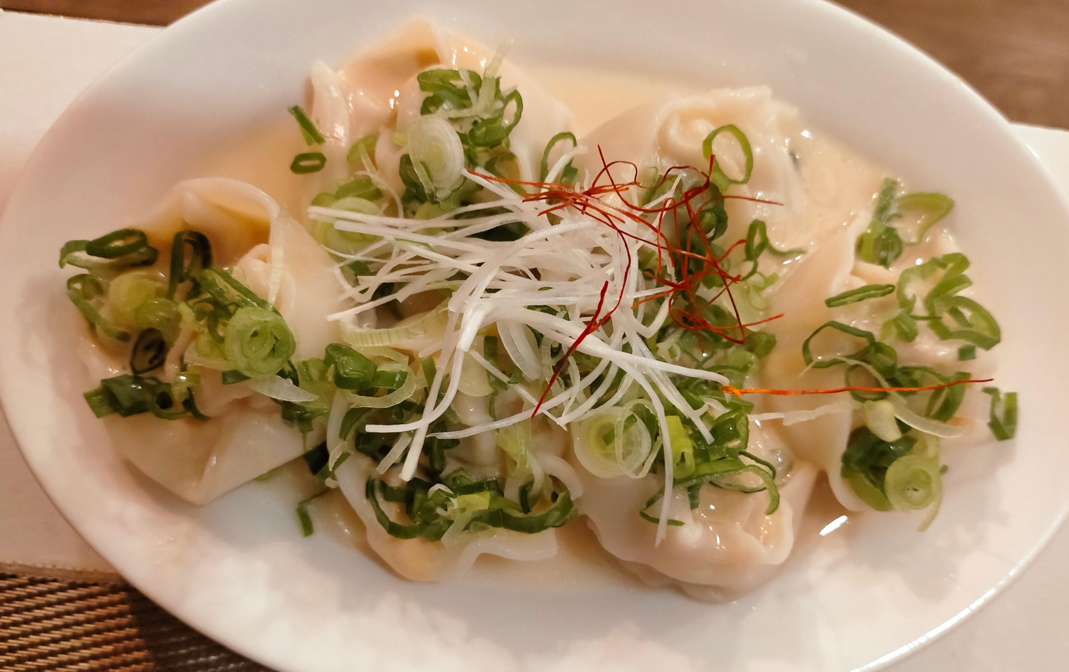 - Gyozas (7,50 €) - Sui generis. La presentación parece más de pasta italiana. El caldito del fondo juraría que era leche de tigre. El conjunto, raro, raro...