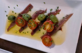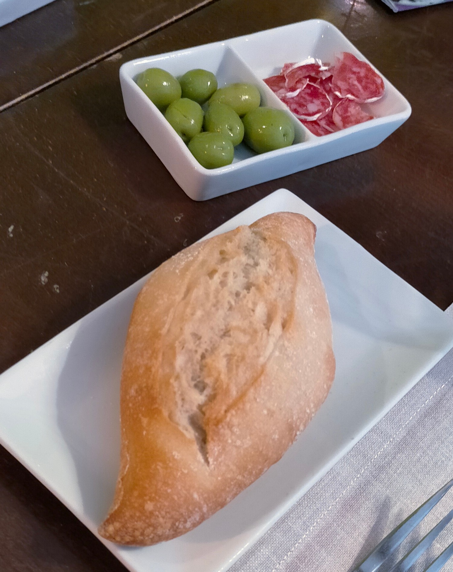 Dinar a la carta per a quatre. Vam començar amb unes olives correctes i una mica de fuet obsequi de la casa, seguit d'unes anxoves normaletes, també obsequi de la casa. Bé, obsequi el que es diu obsequi... Ens van cobrar 2,95 € per persona en concepte de "Pa i servei". Van servir alguns plats un pèl massa ràpid, de manera que va haver-hi problemes per encabir-los a taula.