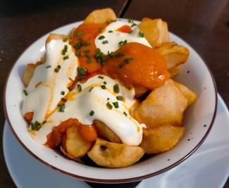 - Braves de Ca L’Estrany, confitades amb allioli suau i pimentó vermell de La Vera (10,95 €) - No ens semblà que valguessin el que costen. Ens agradà l'allioli, però la patata la trobàrem seca.