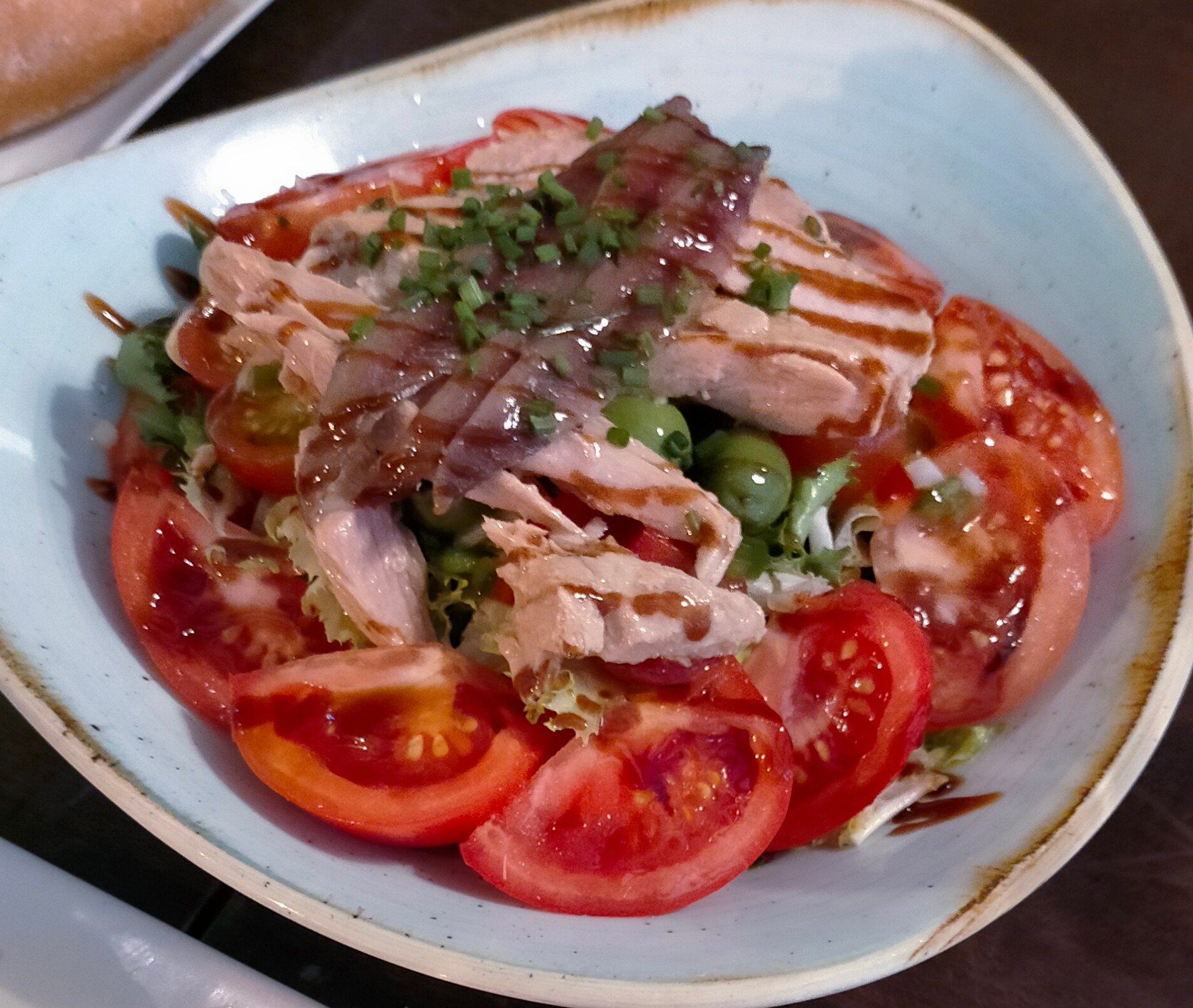 - Amanida de tomàquet del Maresme amb tonyina, anxoves i olives sevillanes (12,95 €) - Bé.