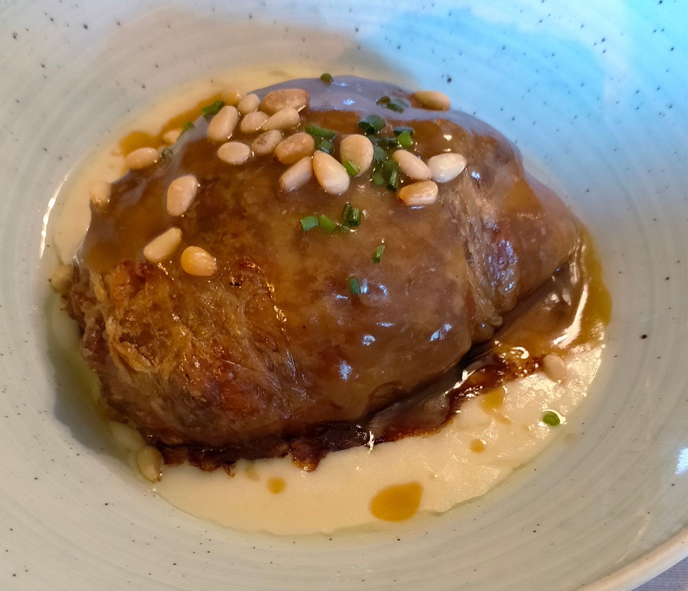 - Peus de porc desossats farcits de ceps i foie amb puré de patata fumat (18,95 €) - Els peus, una mica fats. Al farcit només li vam trobar els ceps. Ni rastre del fumat del puré.