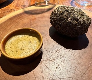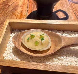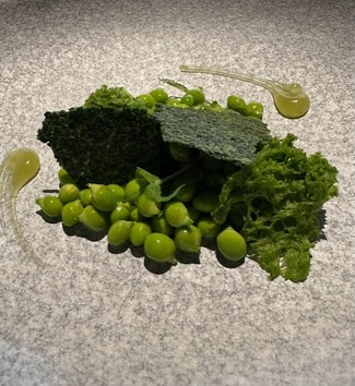 Con los postres fueron 11 pases, la mayoría de ellos largos en su descripción. Todos ellos me parecieron exquisitos y delicados, con sabores bien identificables. Destacaría la “Piel de cebolla en su crema con caldo de verduras ahumado con romero”, el “Sorbete de lechuga de nuestra huerta, lechuga marinada y asada”, los “Guisantes lágrima y menta”, la “Mantequilla con especias y patata con costras de hierbas” y la “Merluza confitada y mojama de atún”.