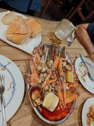 -Mariscada compuesta por Langostinos normales de calidad tirando a baja, Gambas blancas de buen tamaño y sabor buena calidad, centollo bueno y a buen punto de cocción, percebes algo pequeños pero de buen sabor, cigalas normales ricas y nécoras de tamaño mediano y con buen sabor.
