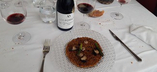 -Arroz seco con setas Sitake y espárragos verdes, delicioso con su toque de socarrat y ese sabor intenso de la Sitake que equilibra mucho con la Mencía del vino Fornos de Otero.