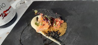 -Tartar de Salmón ahumado, con vinagreta bearnesa, con el más joven de Aníbal de Otero el Otero.
