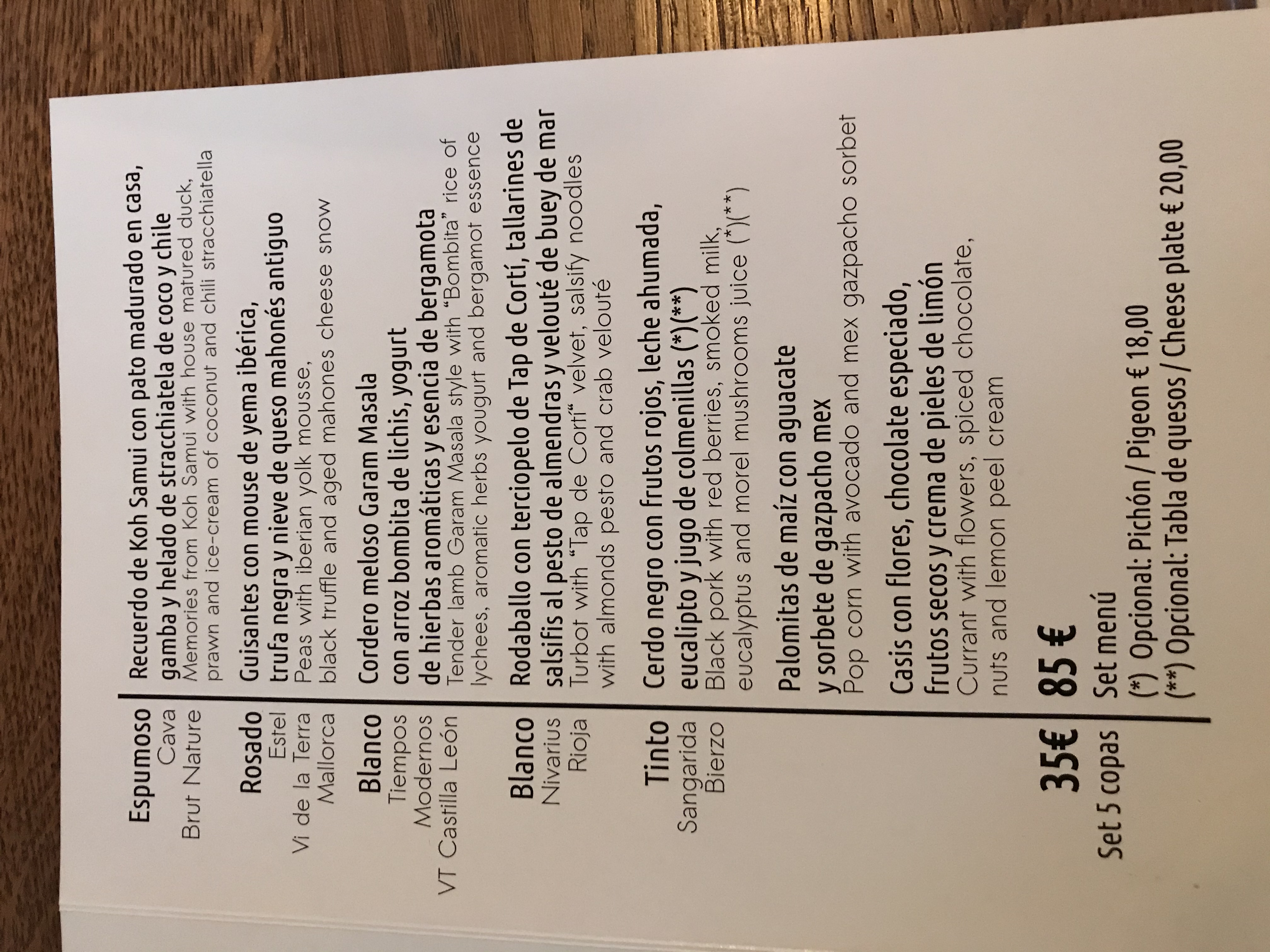El menú que adjunto está bien de cantidades, mucho colorido, pero algún momento falta de sabor o exceso de él. Creativo vanguardista, con camino por delante. Las armonías propuestas, un poco justas en mi opinión, muchas de ellas en magnum.