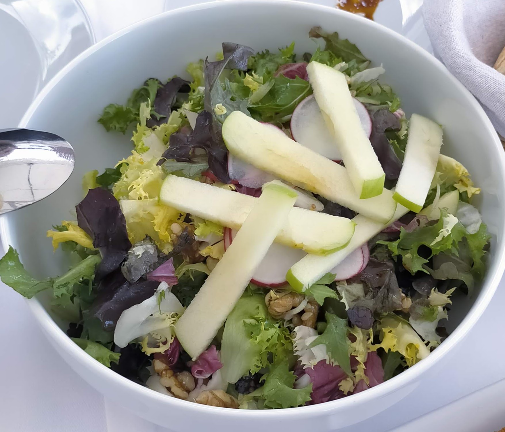 - Ensalada de manzana, rabanitos y nueces con hierbas frescas, vinagreta de lima, miel y mostaza (11,90 €) - Refrescante y ligera.