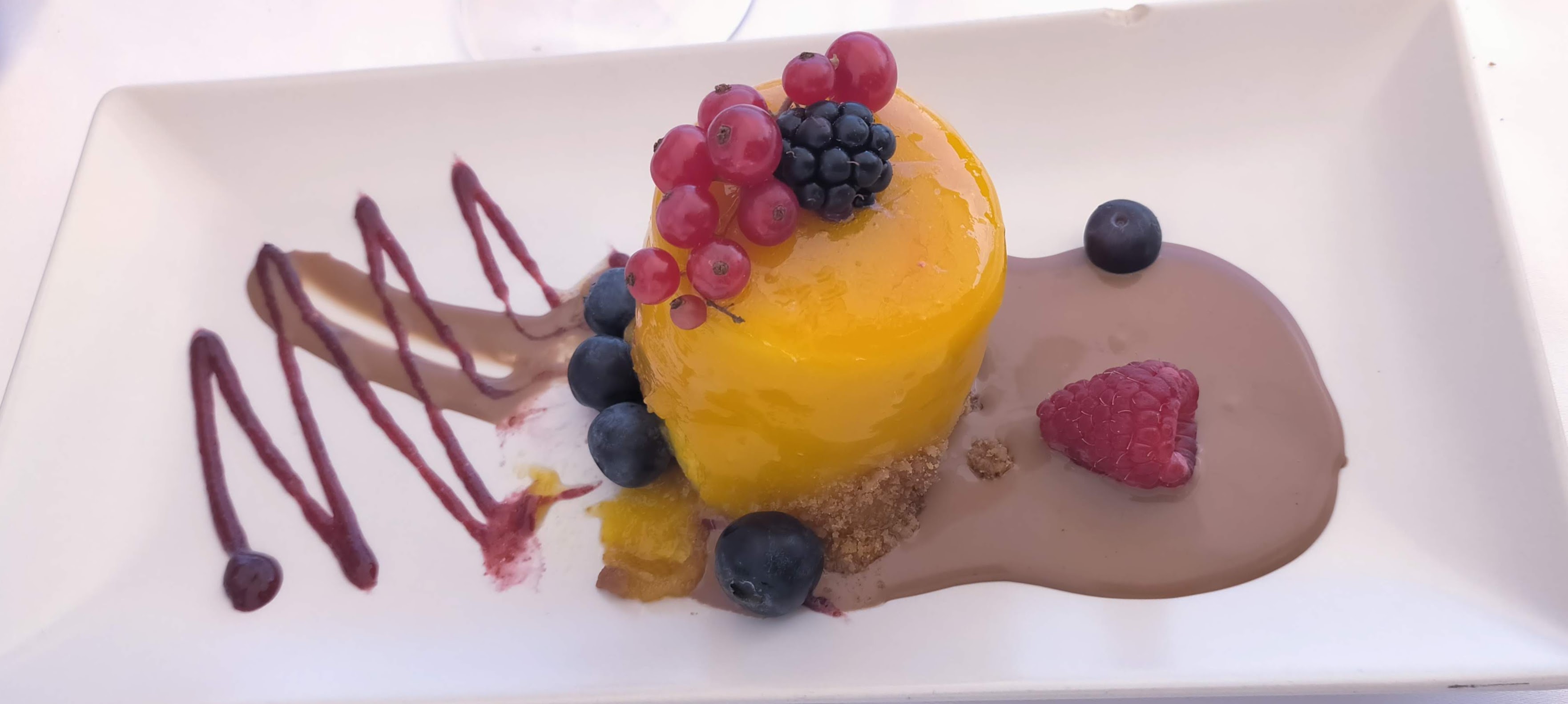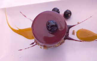 - Cremoso de queso de cabra y mousse de maracuyá sobre galleta de canela (6,80 €) - Fantástico.