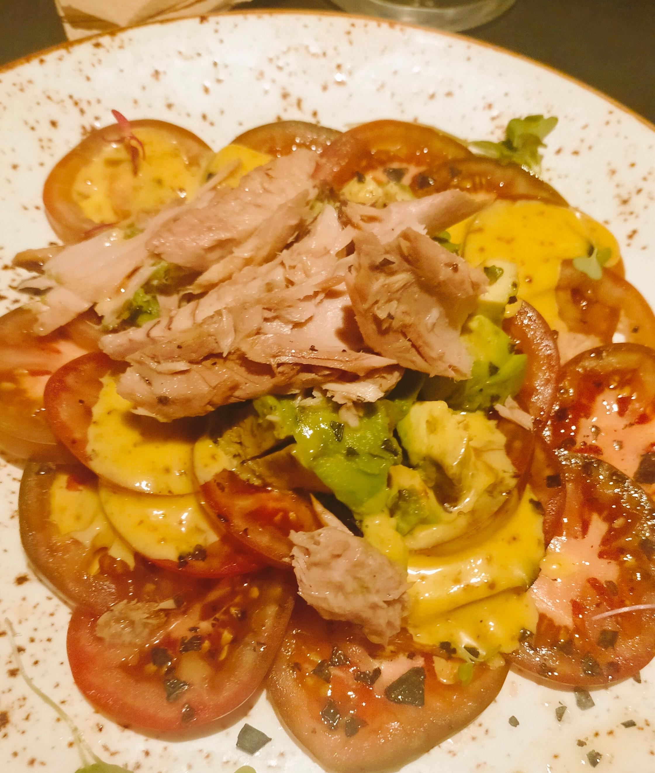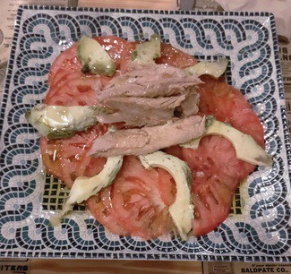 - Ensalada de tomate y melva con AOVE y miel y mostaza - El tomate lo recordaba mejor. La presentación, también.