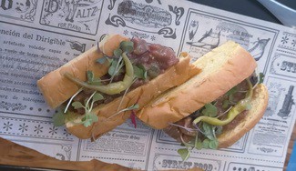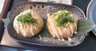 Almuerzo ligero para cuatro a base de platos para compartir. Empezamos con la tapa de la primera ronda de bebidas.