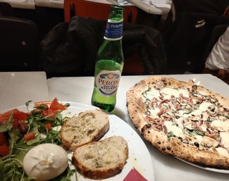 Pizza Nap especialidad de la casa, embutidos, champiñones, trufa negra y queso doble de mozarela a 12'90€, grande con bastantes ingredientes y bien hecha, muy rica.