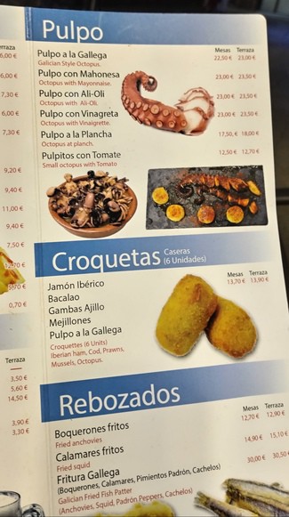 Vino blanco Ribeiro algo caro, casi 4€ la copa, doble de cerveza Mahou a 2'80€, normal para la zona.