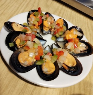 Comimos mejillones en salsa brava, con vinagreta, son raciones de docena a precio medio de 6€, no está del todo mal para un local clásico en pleno centro de Madrid.