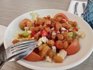 -Ensalada de queso de cabra con frutos secos y fresa, contraste de sabores rica sin más.