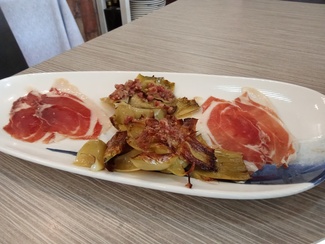 -Flor de alcachofa con jamón ibérico, rica, de bote pero bueno estaba rica.