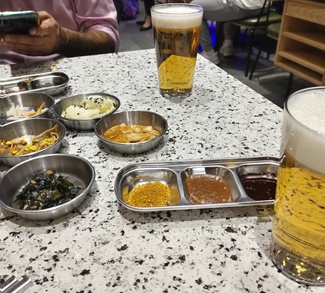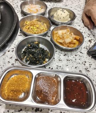 De aperitivo te ponen diferentes verduras fermentadas y salsas para la carne, con una sal de especias orientales.