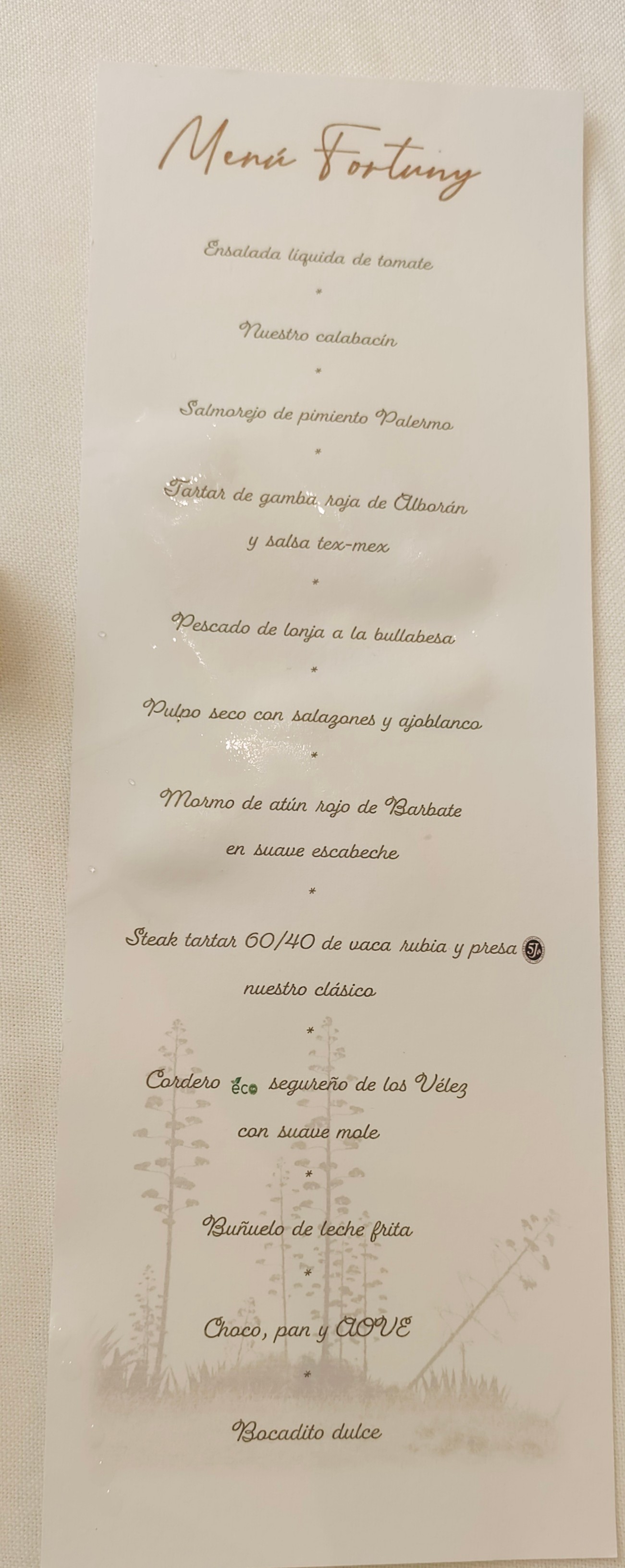 Almuerzo para cuatro. Reservamos el menú Fortuny (70 €) porque nos lo recomendó un cocinero de la zona, explicándonos que, en su opinión, era el que mejor representaba los productos de proximidad y la cocina del dueño.