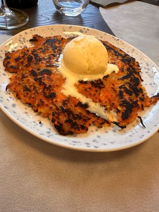 . tortilla coreana dulce con helado de vainilla: lleva jengibre y aunque el aspecto es mejorable, está bien de sabor siempre que se tome con el helado; en caso contrario que muy simple. La tortilla algo quemada en los bordes.