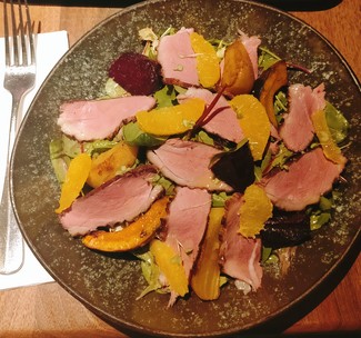 - Ensalada de pechuga de pato con rúcula, calabaza, remolacha, naranja, piñones y aderezo de miel y jengibre (5.880 HUF) - De buen tamaño. El pato, bueno. La ensalada, prescindible.