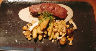 - Lomo de venado con pasta, setas, avellanas y salsa trufada (8.980 HUF) - Ración generosa. Lo mejor, la salsa, que sabía a trufa. La carne, bien. La guarnición, raruna, especialmente la pasta, que confundí de inicio con patatas fritas.