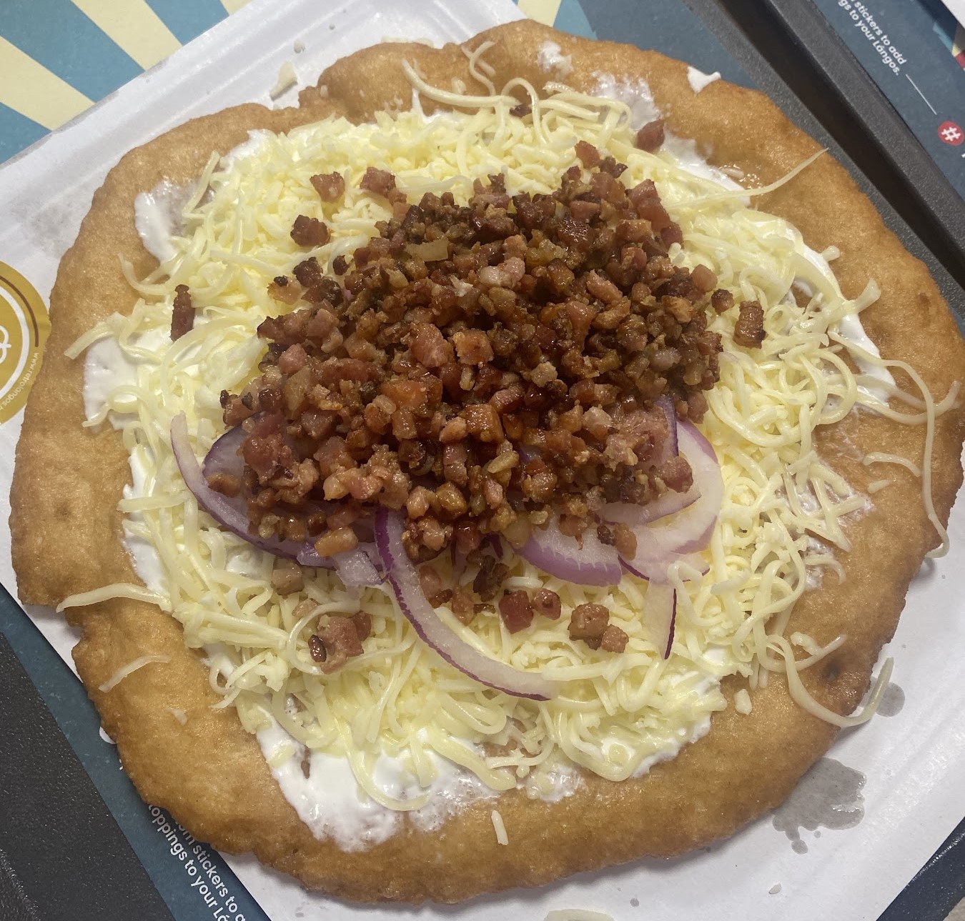 - Lángos húngara (3.500 HUF) - La pidió mi acompañante. Lleva crema agria, queso, bacon y cebolla roja. Se la comió sin más. El único comentario fue que la masa sabía a churros.