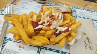 Volvimos otra noche. Como había almorzado bien, solo pedí patatas fritas (2.000 HUF). Las he probado peores, pero no muchas. Con mucha salsa y el refresco, puede tragarlas.