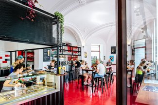 Se pide en el mostrador, te dan un ticket y, cuando escuchas que el camarero, que va paseándose por el comedor o la terraza con una bandeja, canta tu número, levantas la mano y te deja el pedido.