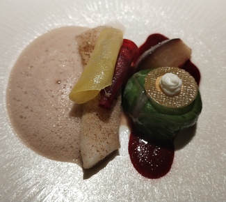 Magret asado, muslo en cocotte sellada, apionabo y fruta de la pasión, salsa como en Rouen