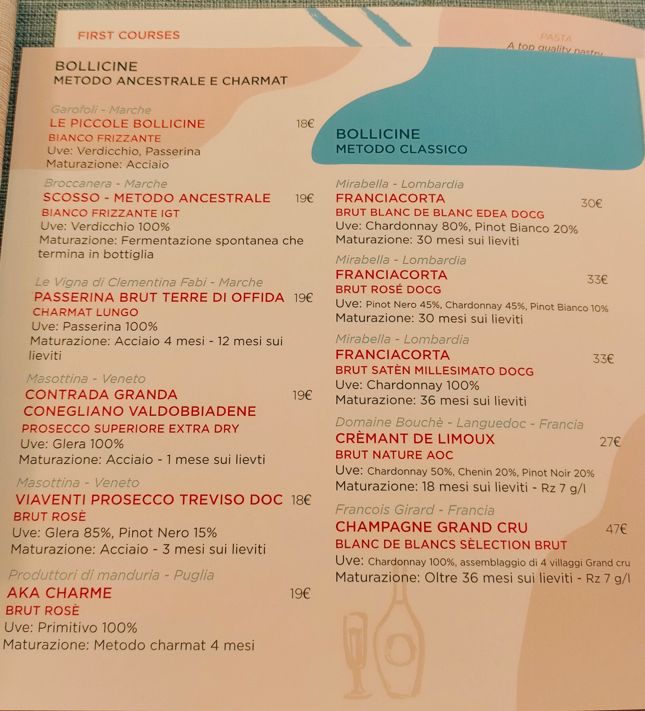 Para beber, una botella de agua (2,50 €) y una botella de Mirabella Satèn Millesimato 2021 (33 €) con su cubitera, algo subido de temperatura.