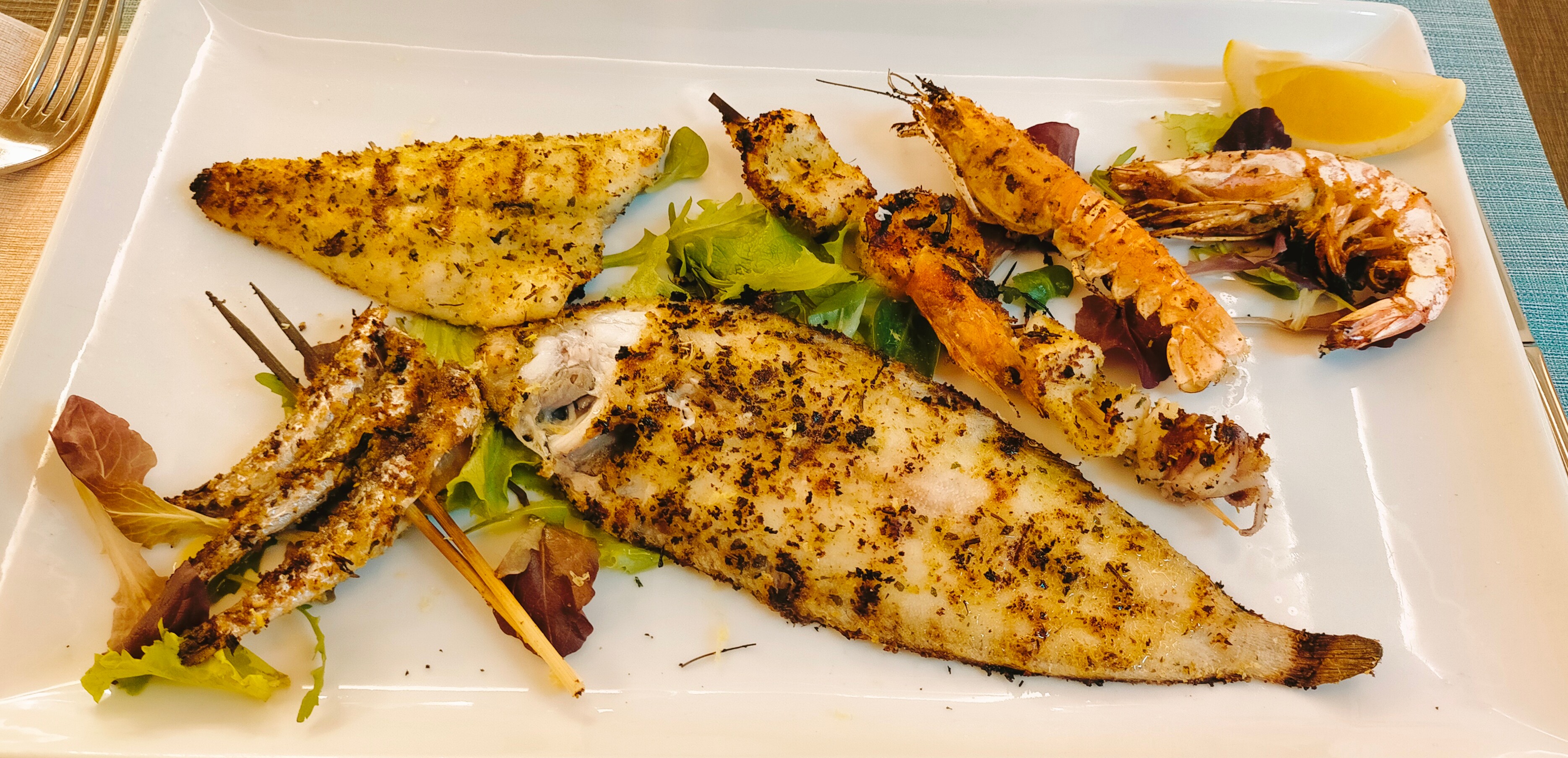 - Grigliata mista alla brace (22 €) - En teoría, llevaba una brocheta de calamares y gambas, sardinas a la brasa, filete de dorada, lenguado, cigalas y gambas. Lo que aparece en la foto de su web: