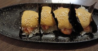 Cena para cuatro a base de platos para compartir. Empezamos con la "tapa": taco-maki de salmón con mayonesa de kimchi. Excelente inicio.