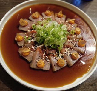 - Usuzukuri de ventresca de atún rojo de almadraba, ponzu y salmorejo (25,50 €) - La única pega es que no era usuzukuri. Por lo demás, de lo que más gustó.