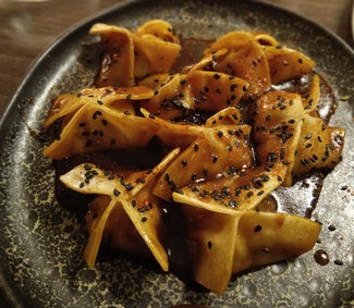 - Gyozas de gamba blanca con jugo de sus cabezas (20 €) - Sabor potente. No solemos encontrar gyozas caseras. Y mucho menos tan ricas.