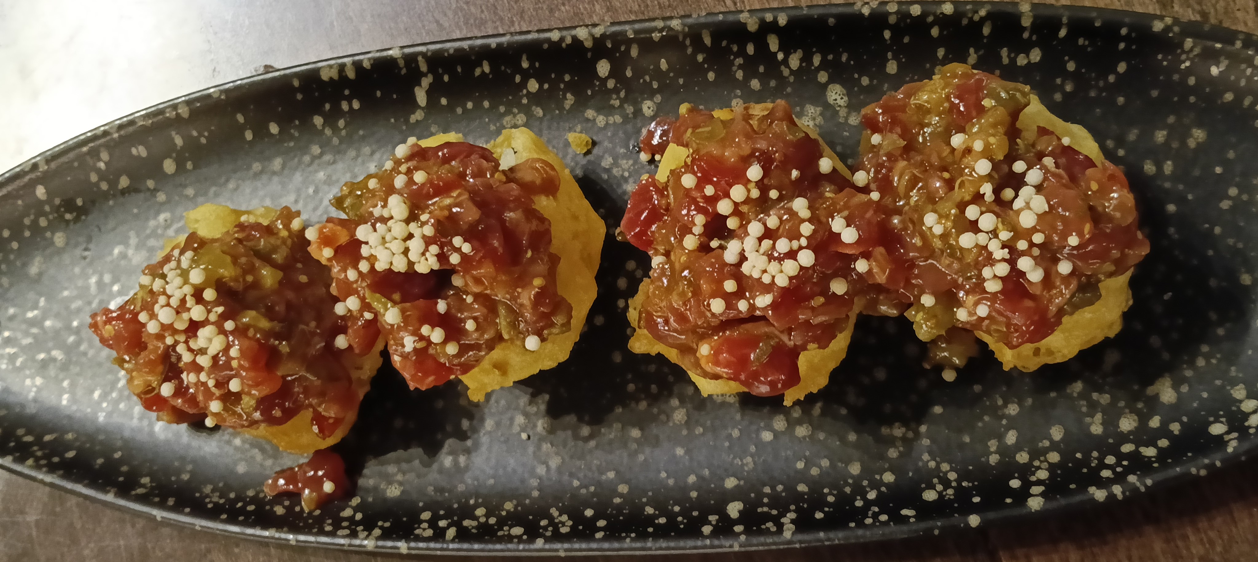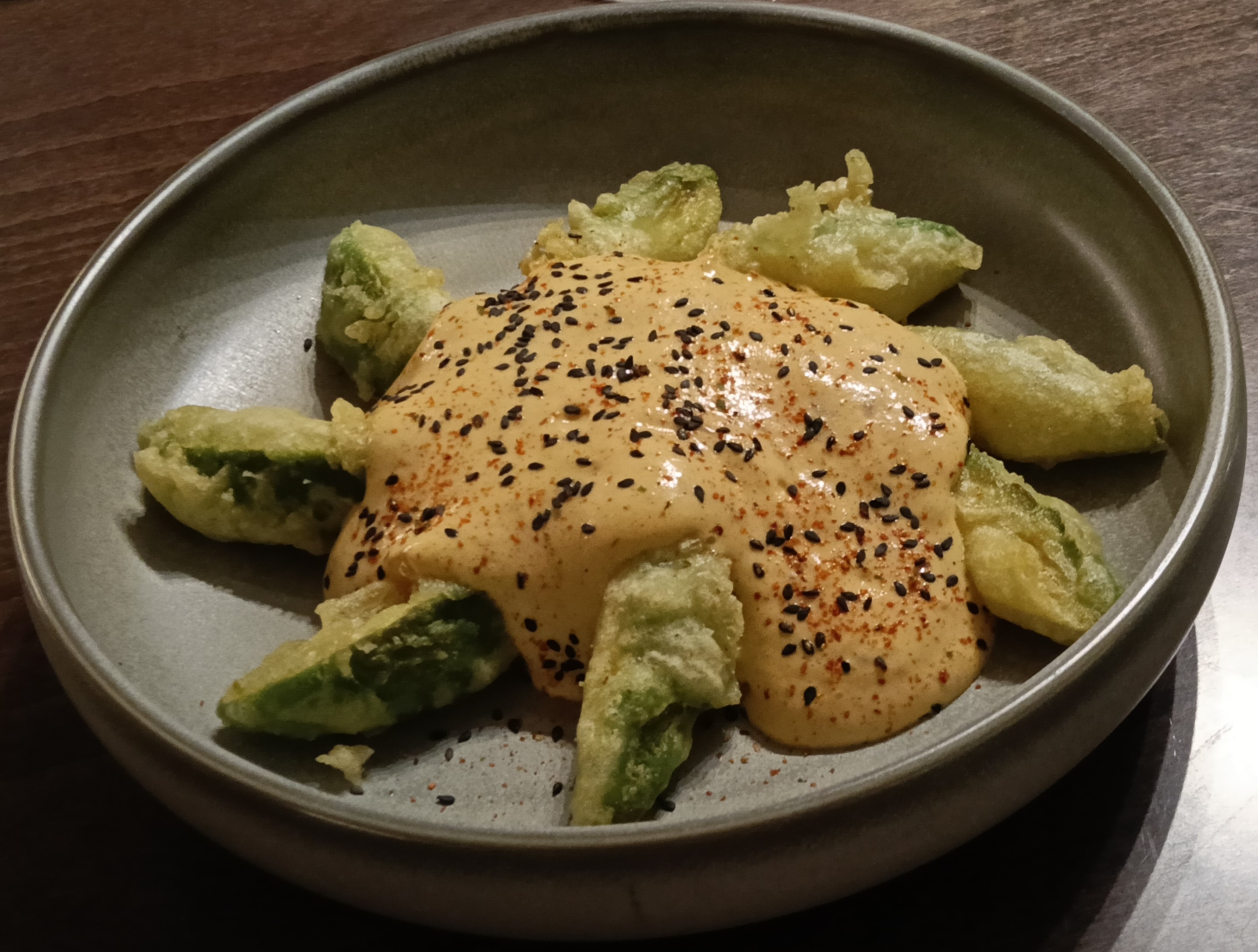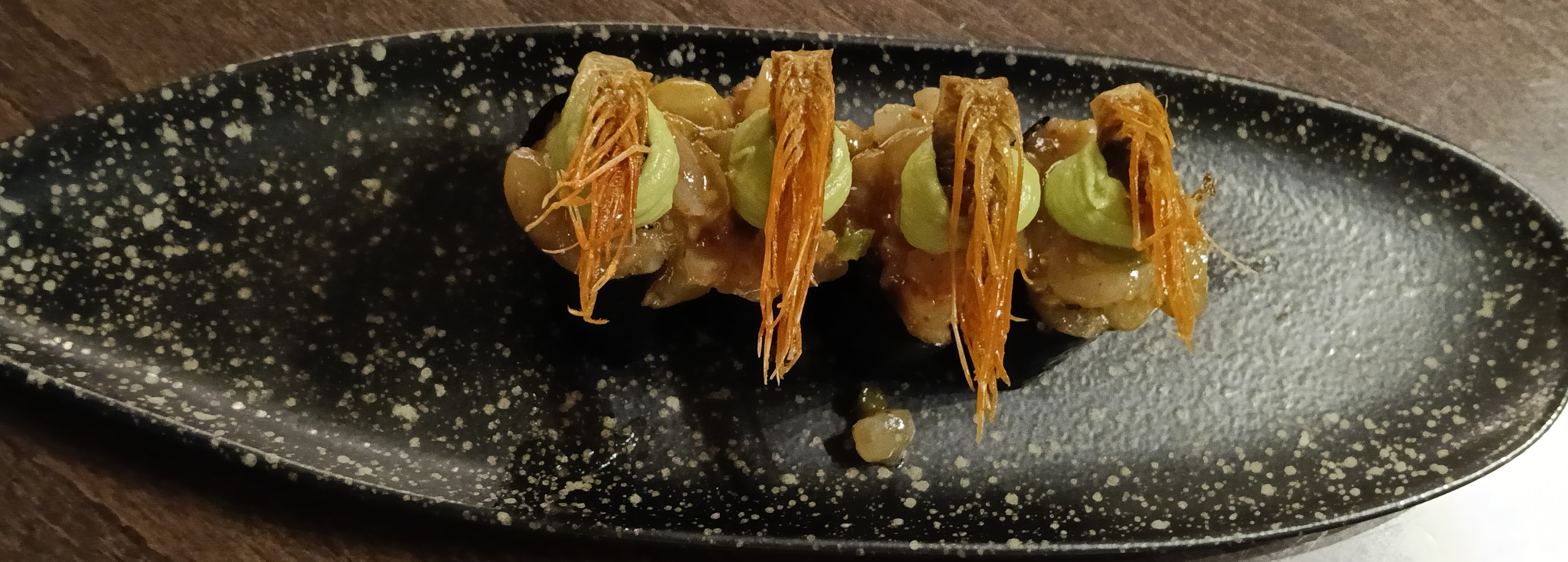 - Tempura de aguacate con espuma de kimchi y tierra de calamar (12 €) - No soy muy aficionado al aguacate, pero a mi familia le encantó.