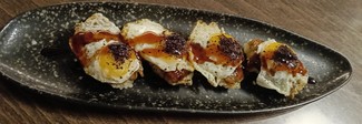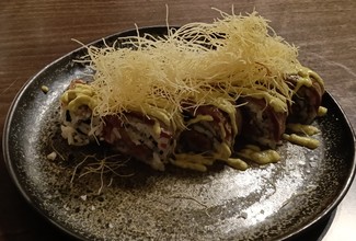 - Uramaki de lomo de vaca madurada con relleno de verduritas, salsa huacatay y cancha (18 €) - Carne muy tierna. Muy sabroso y menos pesado de lo que imaginábamos.