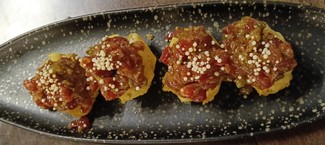- Nigiri de steak tartar con arroz crujiente (18 €) - La carne nos pareció muy bien sazonada. Nos gustó el punto crujiente que aportaba el arroz.