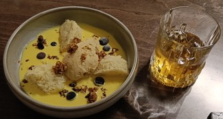 - Bizcocho de almendra, helado de turrón y crema de azafrán (8 €) - Hubiese agradecido un puntito más de azafrán. Encontré delicioso el contrapunto de la acidez de los arándanos. Y un vasito de umeshu (5,50 €) para redondear el postre.
