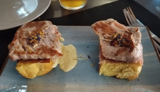 Pan brioche relleno de atún de almadraba con jamón ibérico y mayonesa de pimientos verdes fritos la especialidad de la casa y la verdad estaban muy ricos a 8'80€ unidades.