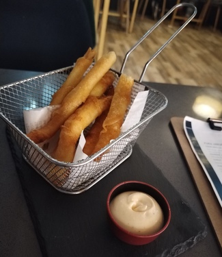 Luego unos churros de pescado gallo rico rico, grujiente y sabroso con salsa de mayonesa kimchi a 5'90€.