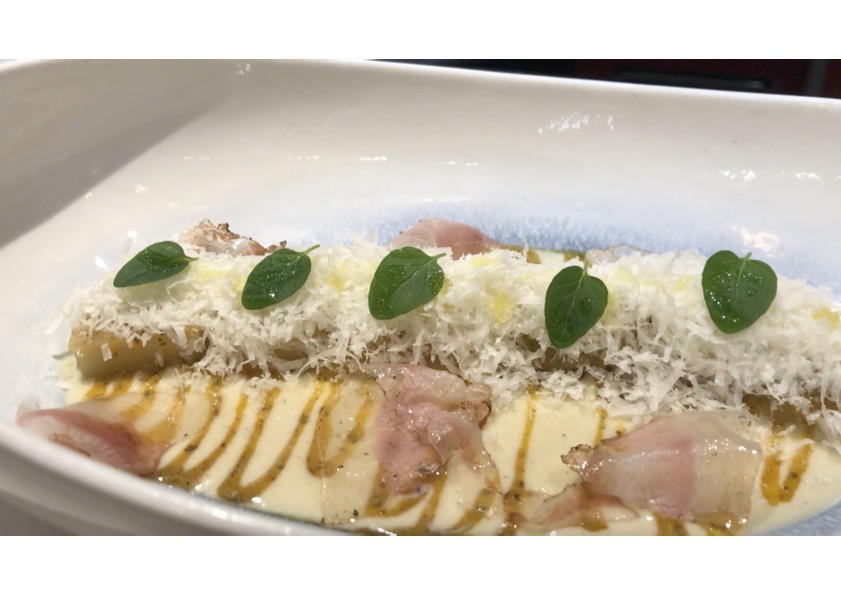 -Puerro a la carbonara, yema curada y nube de grana padano y guanchale